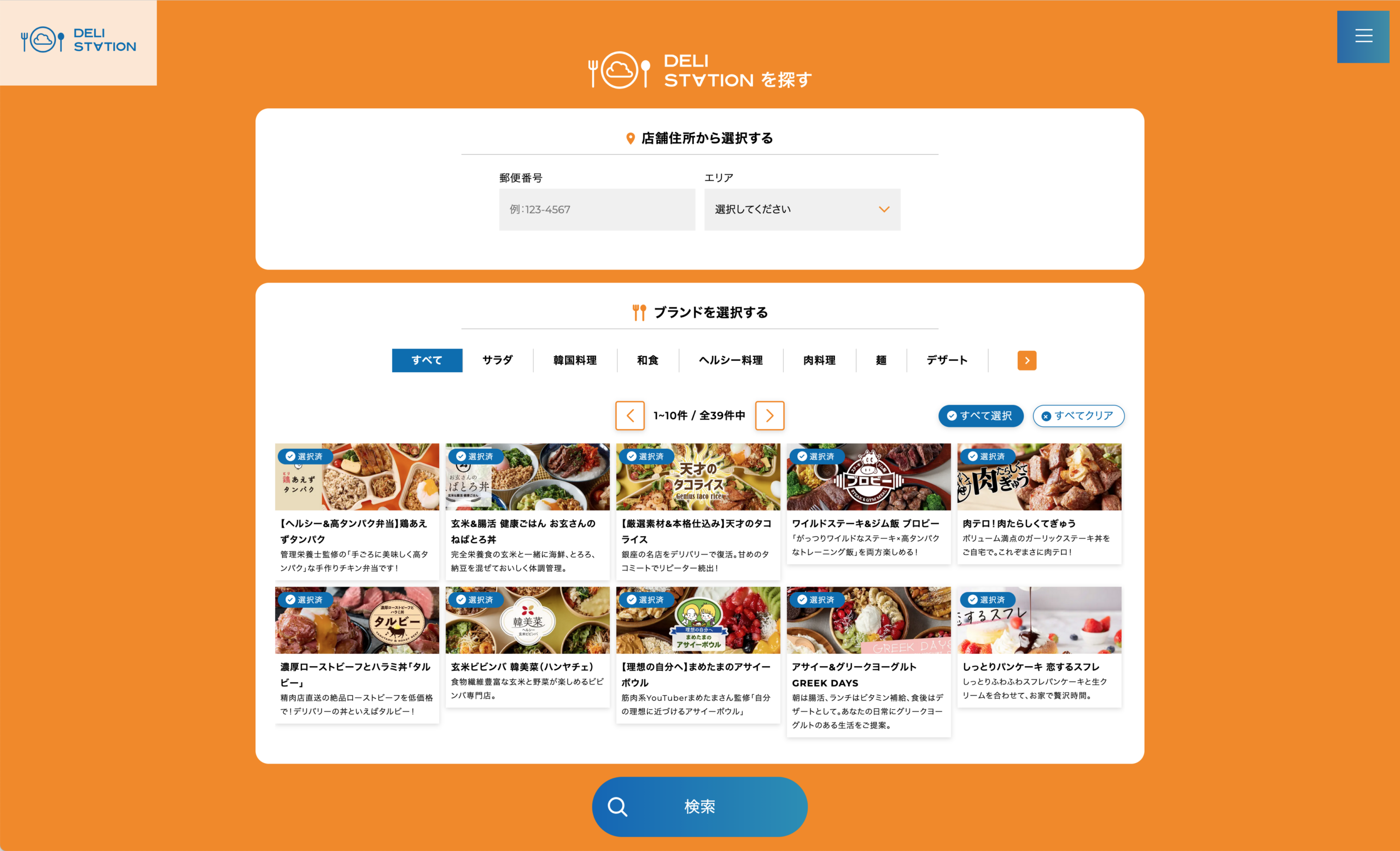 フランチャイズ加盟の検討者に向けた事業紹介、クラウドキッチンの案内、一般ユーザー向けのネット注文機能など、異なるターゲットに対して情報をわかりやすく整理した構成に設計。郵便番号検索やエリア・ジャンルからの店舗検索機能を実装し、ユーザーが近くの店舗にスムーズにたどり着ける導線を構築しました。